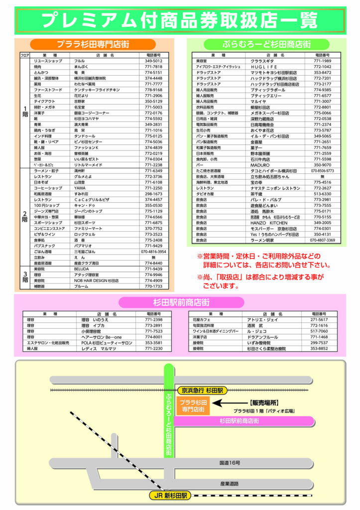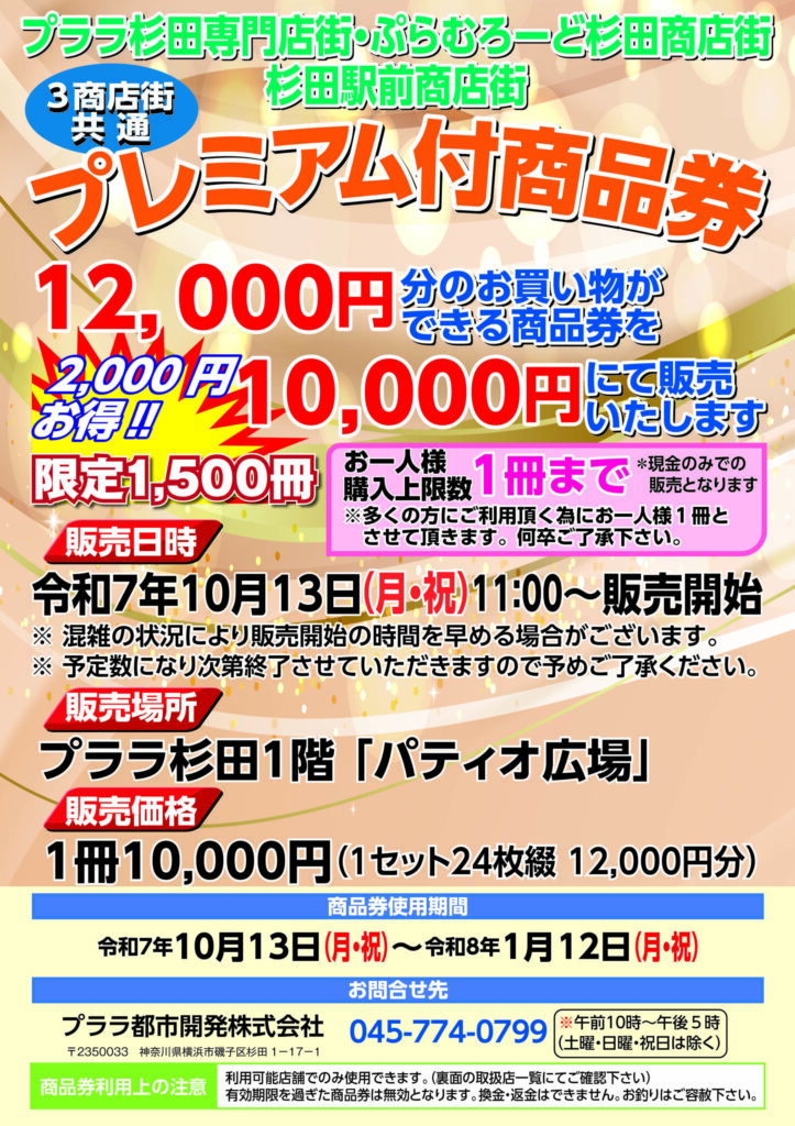 販 売 数 1,500冊 おひとり様、購入上限数1冊まで(現金のみの販売となります。) 販 売 日 時 令和7年10月13日(月・祝) 11:00~販売開始 (混雑状況により繰り上げて販売を行う場合がありますのでご了承下さい) 販 売 場 所 プララ杉田1階パティオ広場 販 売 価 格 1冊、10,000円(1セット24枚綴り 12,000円分) 商品券使用期間 令和7年10月13日(月・祝)~令和8年1月12日(月・祝) |