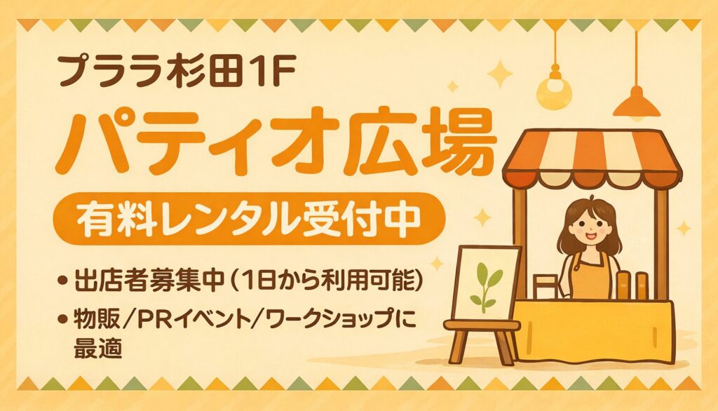 販売・展示・ワークショップなど幅広く対応。 2026年2月25日 最終更新日時 : 2026年2月25日 プララ杉田 あなたの活動をもっと多くの人へ。プララ杉田1Fパティオ広場有料レンタル受付中!販売・展示・ワークショップなど幅広く対応。問合せ先:プララ都市開発(株) TEL 045-774-0799